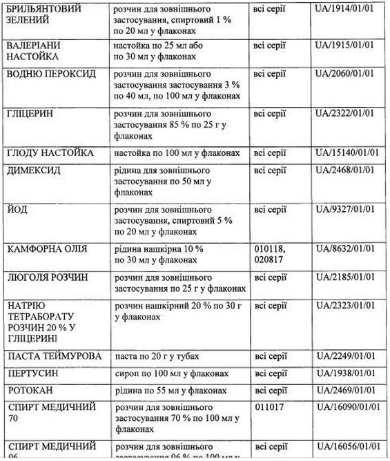Отмечается, что под запрет попали также настойка валерианы, раствор люголя, паста Теймурова, пертусин, фукорцин, спирт медицинский, ротокан и прочее. Полный список состоит из 18 наименований.